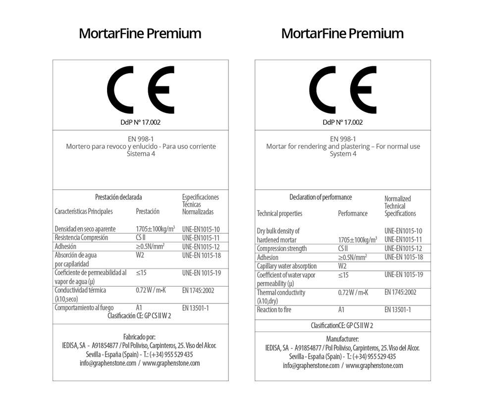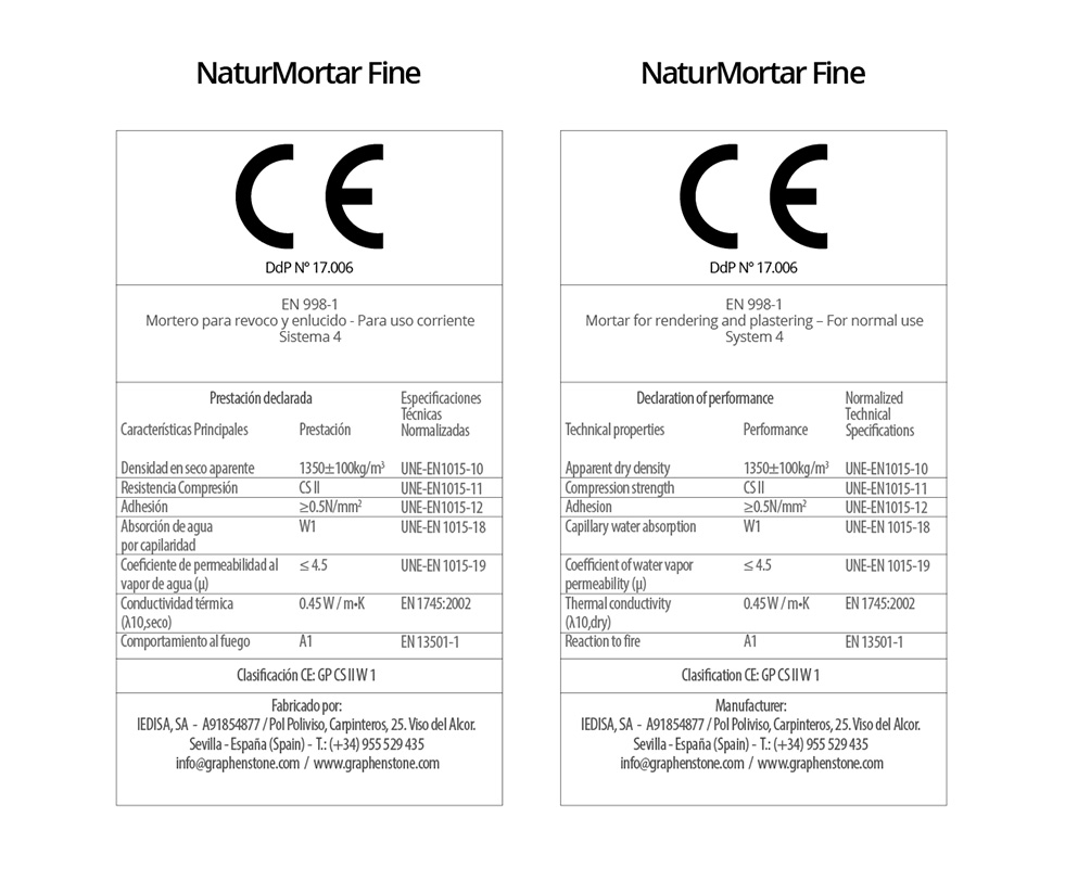 | In accordance with the Regulation (EU) No. 305/2011, a Quality Management System has been implemented in accordance with standard EN 998-1 on the specifications of mortars for rendering and plastering. | ||